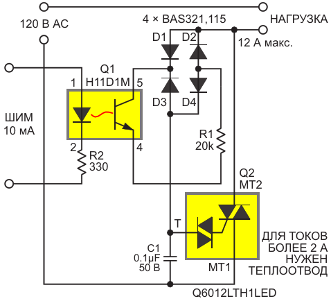 Постоянная времени, определяющая угол проводимости для quadrac Q2, равна R1C1/D, где D - коэффициент заполнения ШИМ от 0 до 100%