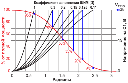 Рисунок 2. Зависимость выходной мощности [VPK×sin(r)]2 от коэффициента заполнения ШИМ. Правая ось - напряжение на конденсаторе C1 (на входе запуска), левая ось - доля полной выходной мощности в зависимости от фазы запуска, а ось X - фаза переме