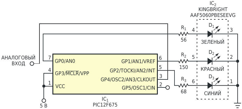 Этот преобразователь напряжения в цвет, содержащий минимальное количество компонентов, использует один многоцветный светодиод для контроля уровня аналогового напряжения