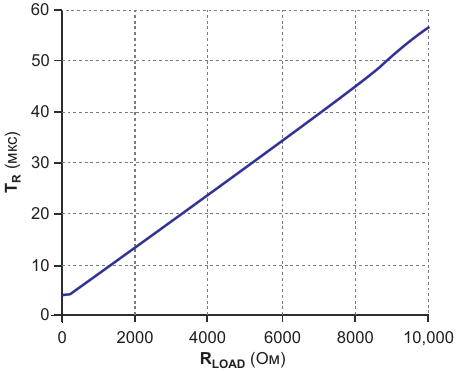 Соотношение между наихудшим временем нарастания и сопротивлением нагрузки для базовой схемы включения фототранзистора показывает, что при TR = 42 мкс RLOAD должно быть равно 7.5 кОм