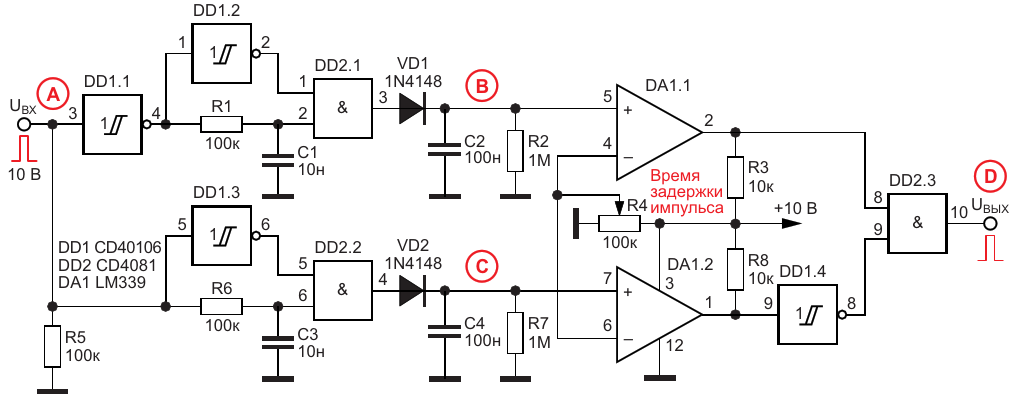 Схема задержки редких или одиночных импульсов на регулируемый временной интервал