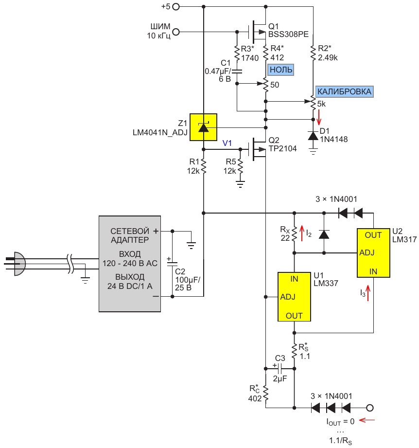 Схема источника отрицательного тока содержит средства компенсации разброса номиналов компонентов, включая отклонения опорных напряжений микросхем U1 и Z1. Обратите внимание, что резистор RS сопротивлением 1.1 Ом должен быть рассчитан на мощност