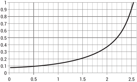Рисунок 3. Зависимость коэффициента заполнения ШИМ D от желаемого угла проводимости R. Ось Y - это D, а осm X - радианы