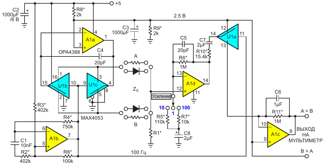 Рисунок 1. Элементы A1a, U1b и U1c формируют точные симметричные импульсы возбуждения согласуемых компонентов A и B. Резисторы, отмеченные звездочкой, - это обычные 1%-ные компоненты; их точность не критична. Напряжение на выходе A > B положительно относительно B >