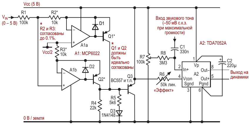 Рисунок 1. Зависимость коэффициента усиления TDA7052A от его управляющего напряжения; теоретическая кривая и результаты практических измерений