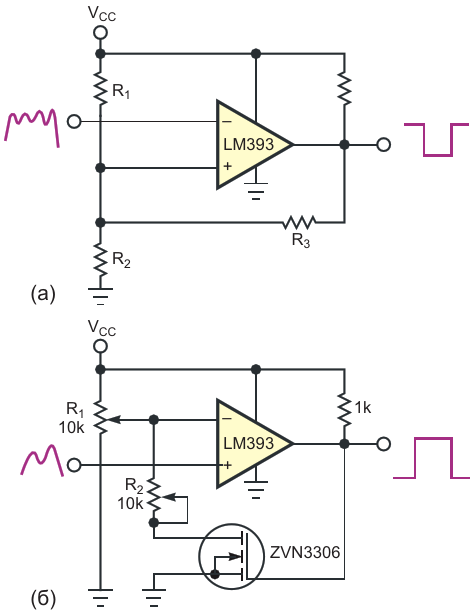 Классическая схема триггера Шмитта (а) требует итеративной настройки, а ограниченный выходной ток операционного усилителя влияет на возможности настройки схемы. Регулируемые пороговые уровни усовершенствованной схемы (б) полностью независимы