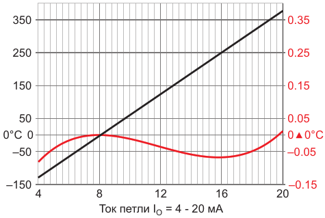 Положительная обратная связь снижает ошибку линейности до значения менее ±0.05 °C в диапазоне температур от -127 °C до +380 °C. Ось X - ток IO (мА), левая ось Y - температура PRTD, правая ось Y - ошибка линейности. T°C =