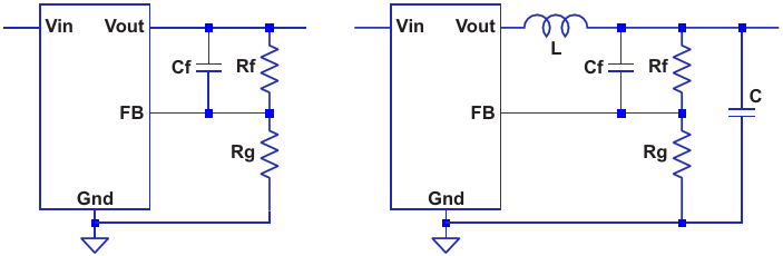 Конфигурации стандартных регуляторов и их цепей обратной связи. Линейный регулятор показан слева, а импульсный - справа
