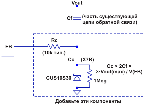 Рисунок 3. Добавьте эти компоненты для защиты вывода FB от отрицательных выбросов при быстрых изменениях выходного напряжения