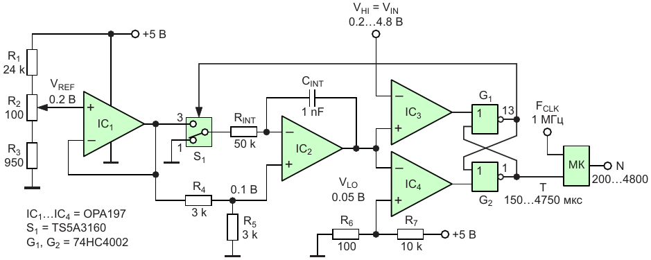 Рисунок 1. Для преобразования постоянного напряжения в последовательность импульсов, период которых пропорционален входному напряжению, в схеме используются интегратор и триггер Шмитта с переменным гистерезисом