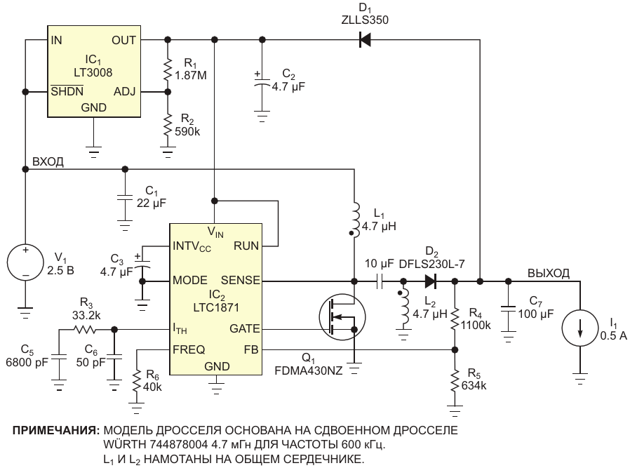 Рисунок 1. Источник питания преобразует входное постоянное напряжение от 2.5 до 20 В в напряжение 3.3 В. Для запуска требуется напряжение 2.5 В
