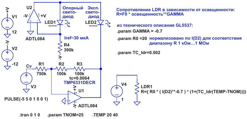 Рисунок 1. Схема экспоненциального управления резисторным оптроном, в которой опорный светодиод используется для преобразования линейного управляющего напряжения в экспоненциальный ток, а два согласованных светодиода служат для температурной компенсации