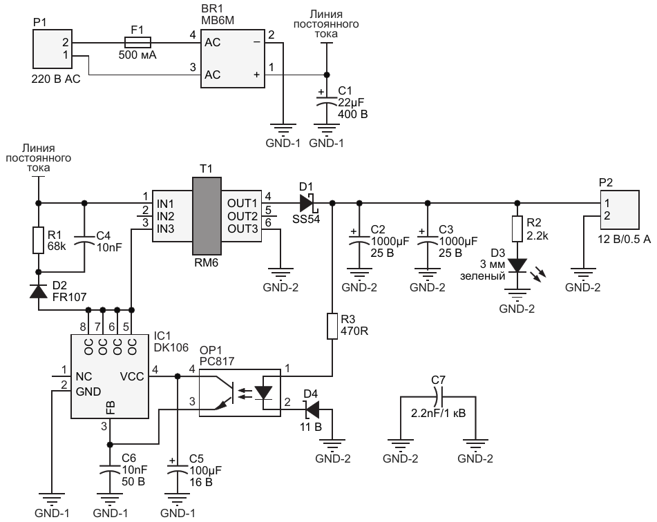 Принципиальная схема изолированного обратноходового AC/DC преобразователя, преобразующего напряжение 85-260 В переменного тока в постоянное напряжение 12 В при токе нагрузки до 0.5 А