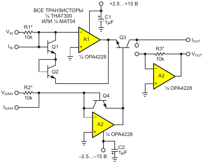 Рисунок 1. Быстрая, термокомпенсированная, не требующая калибровки и точная (если транзисторы хорошо согласованы) схема возведения в квадрат