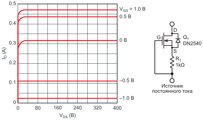 Вольтамперные характеристики MOSFET DN2540, работающего в режиме обеднения, и схема простого источника тока, выполненного на его основе