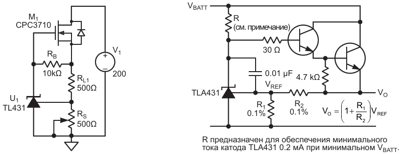 Рисунок 2. Источники тока с более предсказуемыми токами на основе MOSFET IXYS (слева) и на основе регулятора напряжения Texas Instruments (справа)